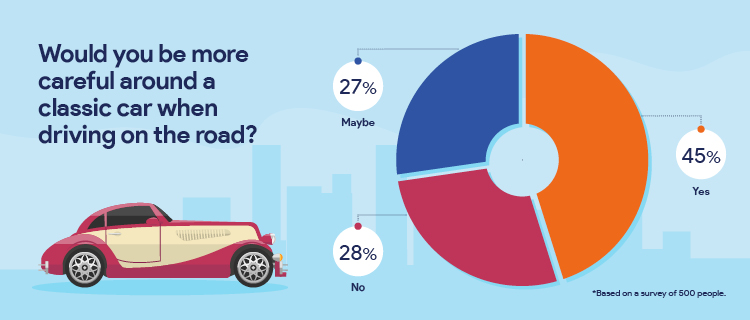 - 45% of motorists are more careful on the road around classic cars.