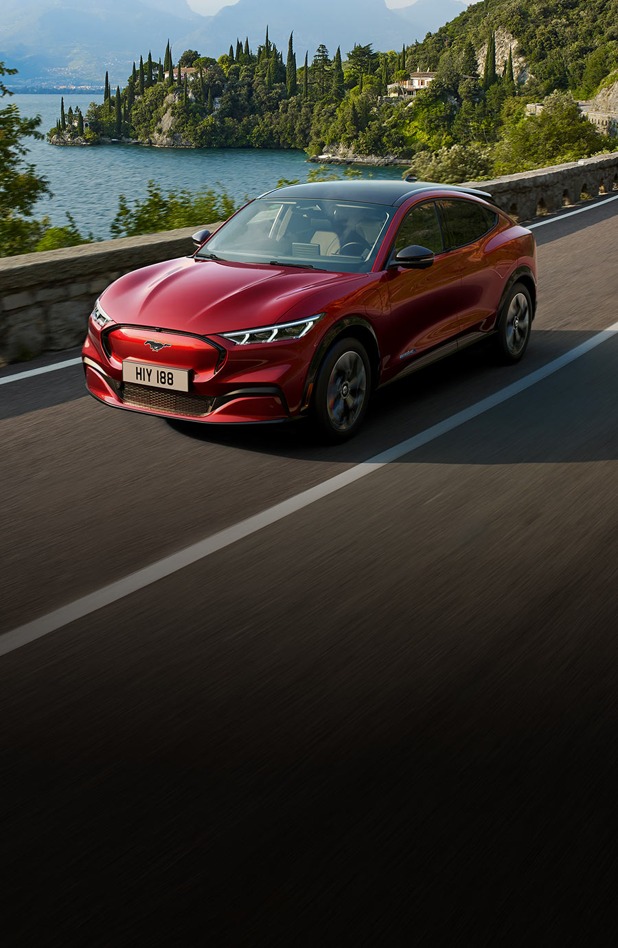 * Based on full charge of Mustang Mach-E Premium RWD with Extended Range battery. Estimated range using Worldwide Harmonised Light Vehicle Test Procedure (WLTP). Figures shown are for comparability purposes and should only be compared with other vehicles tested to the same technical procedures. Actual range varies with conditions such as external elements like temperature, driving behaviours, route profile, vehicle maintenance, and lithium-ion battery age and condition. 372-mile WLTP Overall Range reflects a combined driving cycle and 306-mile WLTP Extra High range reflects motorway driving – both tests are conducted in controlled conditions with an ambient temperature of 23 degrees Celsius and no climate or electrical load.