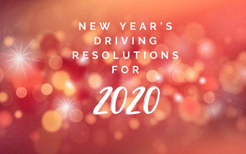 Festive red and orange bokeh background with sparkling star effects and white text reading 'New Year's Driving Resolutions for 2020', highlighting new and used cars for the New Year driving resolutions.