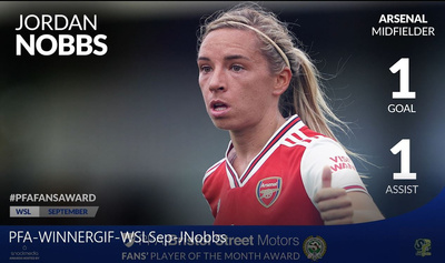 Jordan Nobbs has been voted the PFA Bristol Street Motors Fans WSL Player of the month for September. In a vote run by fan engagement experts, Snack Media, the Gunners midfielder won with 24% of the vote, beating Tottenham s Rachel Furness, who finished in second place with 17%.