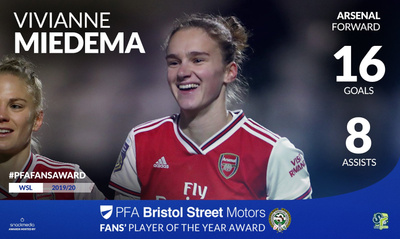 Vivianne Miedema has been voted the WSL PFA Bristol Street Motors Fans Player of the Year for 2019/20 by football fans across the country.