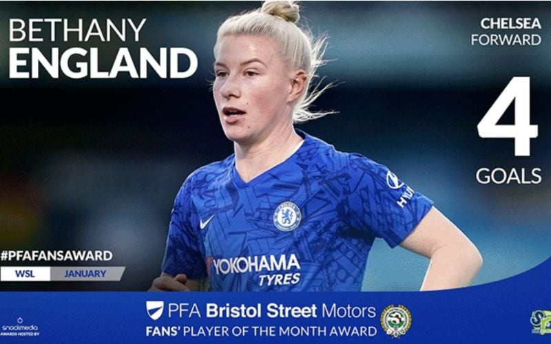 Bethany England has been voted the WSL PFA Bristol Street Motors Fans Player of the Month by football fans across the country. In a vote run by fan engagement experts, Snack Media, the Chelsea forward won with 18% of the vote for January, with Manchester City s Lauren Hemp coming close in second place with 17%.