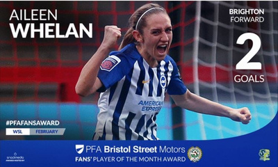 Aileen Whelan has been voted the PFA Bristol Street Motors Player of the Month for February by football fans across the country.