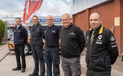 Colin Robinson parts supervisor, Mark Smith master technician, David Stevens service and maintenance technician and Richard Jennens parts manager at Bristol Street Motors Renault Derby together with Lee Hart senior technician at Bristol Street Motors Nissan Derby all received long service awards to recognise their loyalty.