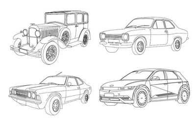 The cars featured are a 1930s Vauxhall Cadet, a 1970s Mk 3 Ford Cortina and Mk 1 Ford Escort, plus the brand-new all-electric Hyundai IONIQ 5.