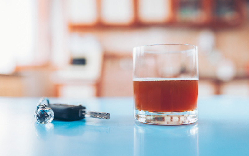 A glass filled halfway with brown liquid placed on a blue surface next to a set of car keys with a diamond-shaped keychain. The background is a blurred kitchen setting. The image does not contain any text related to used cars or new cars.