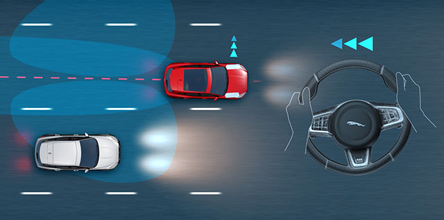Should your vehicle begin drifting out of a lane, the E-PACE gently steers you back, alerting you while it does so.