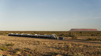 Road trains of up to four trailers are only permitted in Australia s vast Outback regions and typically carry fuel, mineral ore and cattle between remote rural communities. Strict regulations limit their length to 53.5m so Land Rover obtained special permission to pull seven trailers and the 12-tonne tractor unit - retained to operate the hydraulic brakes fitted to the trailers.