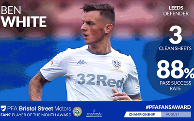 Ben White has been voted the PFA Bristol Street Motors Fans Championship Player of the month for August. In a vote run by fan engagement experts, Snack Media, the Leeds United defender won with 44% of the vote, beating Swansea City s Borja Baston, who finished in second place with 16%. In the second of five divisional votes carried out over nine days via Snack s digital and social networks and supported by top flight football clubs and press, it was evident that the Brighton loanee s impressive performances- in which he helped keep three clean sheets at the back - has resonated with football fans up and down the country. The full list of contenders from the final shortlist polled were as follows: Ben White (Leeds United) - 44% Borja Baston (Swansea City) - 16% Lyle Taylor (Charlton) - 15% Daniel Johnson (Preston) - 12% Patrick Bamford (Leeds United) - 9% Jarrod Bowen (Hull City) - 5% The League One vote opens at 11am on Wednesday 4th September. To vote go to: https://www.vertumotors.com/pfaawards/