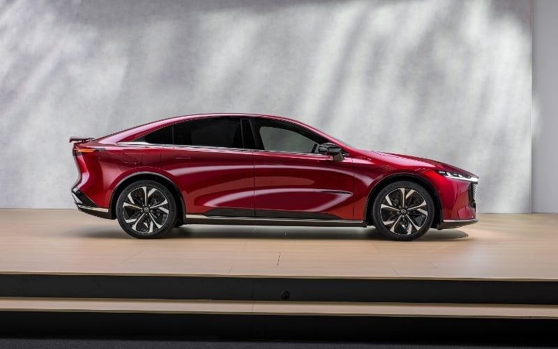 The Mazda6e's 19-inch wheels have a range-boosting aerodynamic design that features a sporty five-spoke design with flat black surfaces, whilst the rear of the car includes an electronically extendable rear spoiler that can be used to enhance stability at speed.