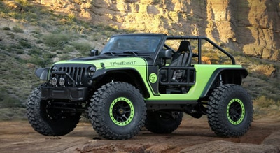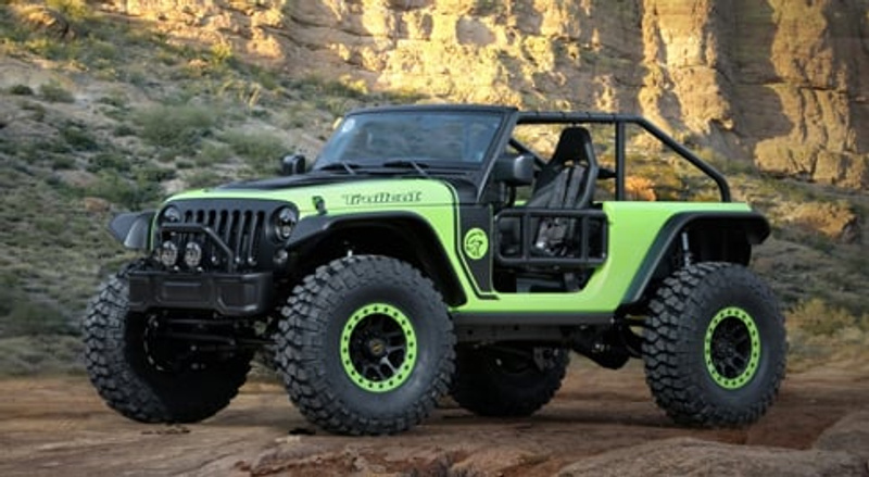 The Trailcat Concept draws inspiration from the Wrangler, but its wheelbase has been increased by 12 inches, in order to fit the vast eight cylinder engine.