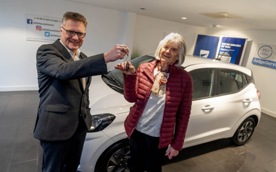 Sally collected her brand-new car from Bristol Street Motors Silverlink Hyundai, with Bristol Street Motors Chief Executive Robert Forrester, and St Oswald's Fundraising Marketing Manager Nikki Maguire handing over the keys.