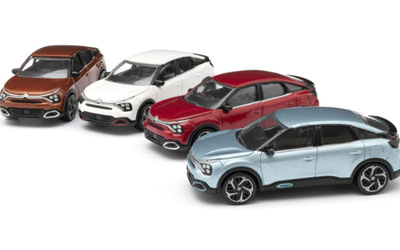 Two colours are available at 1/43 for the New C4 and e-C4-100% electric: Caramel Brown and Iceland Blue. In 1/64 scales, there are four colours available: Elixir Red, Polar White, Iceland Blue and Caramel Brown.