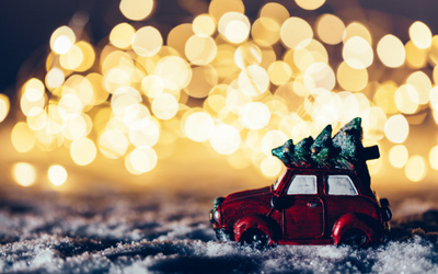 Red toy car carrying a miniature Christmas tree on its roof, placed on a snowy surface with blurred warm yellow bokeh lights in the background, representing new cars and used cars during the holiday season.