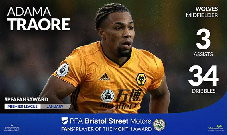 Adama Traore has been voted the Premier League PFA Bristol Street Motors Fans Player of the Month by football fans across the country.